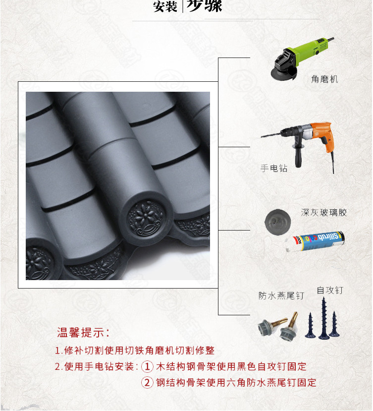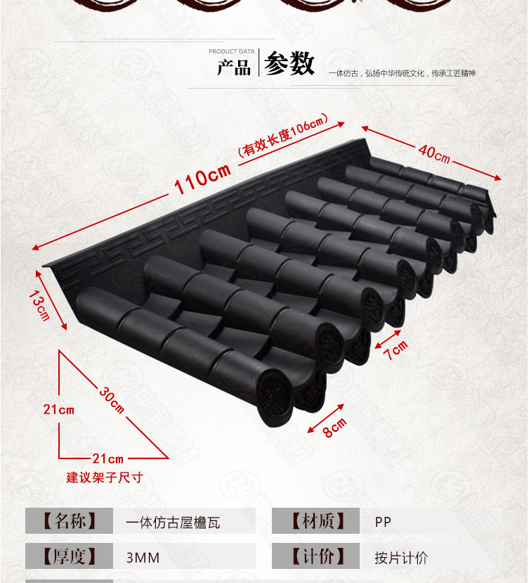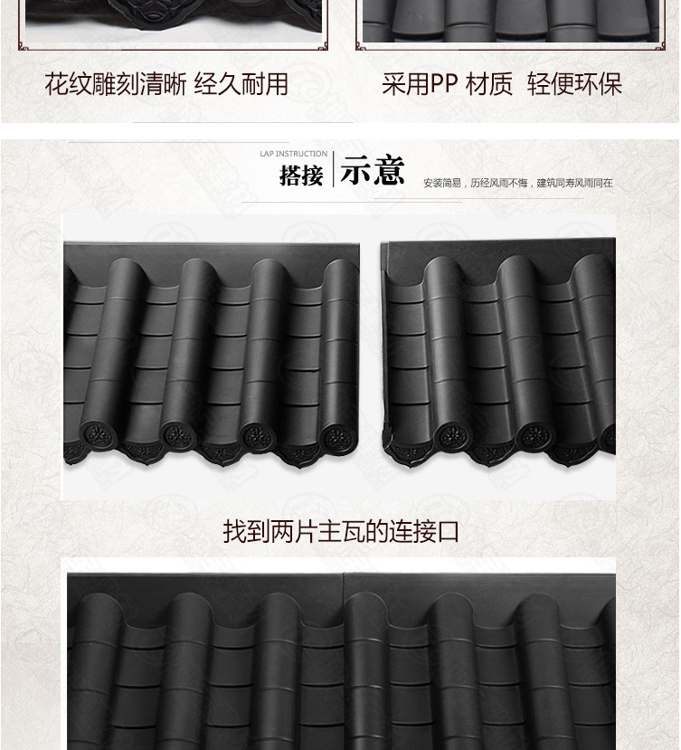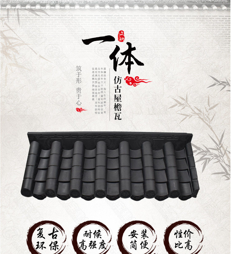 一体仿古屋檐瓦具有中式风格,中国古韵、传承中华之美。一体化铸造而成,檐口平整光滑,使用高分子材质,经久耐用,牢固不脱落,久经风雨考验饱经风霜。印有精美花纹,独特设计,更显优雅。一体成型,安装快捷,全新搭接设计,方便实用,链接缝隙小,视觉更美观。
