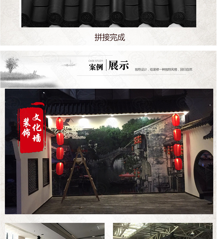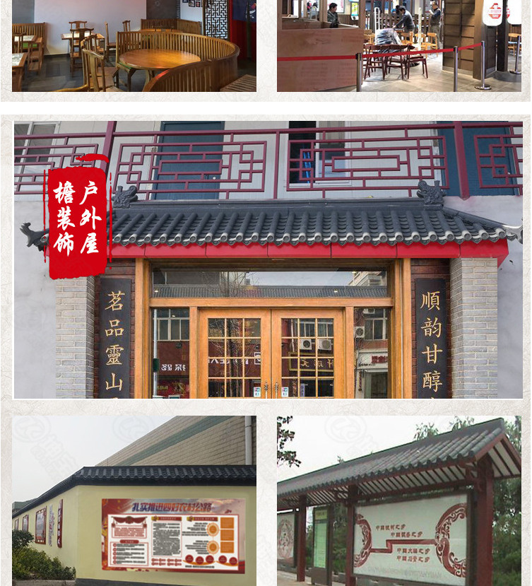 一体仿古屋檐瓦不仅应用于装饰设计(餐饮店、饭店、农家乐等),还广泛应用于室外门头,墙头瓦,街道美化改造等多地。